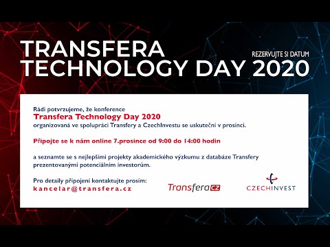 V pondělí 7. 12. 2020 se uskutečnil TRANSFERA TECHNOLOGY DAY 2020, který připravila Transfera.cz společně s agentrurou CzechInvest, společností Busyman a Technologickou agenturou ČR. Zástupci businessové komunity a investorů hodnotili komerční potenciál 10 zajímavých výzkumných projektů z českých vysokých škol a dalších výzkumných organizací.